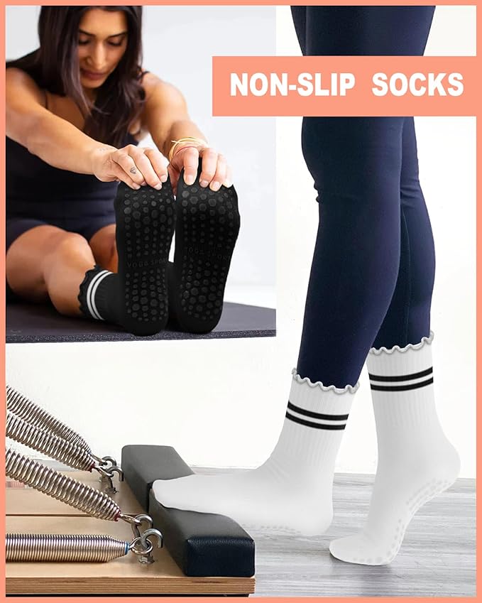 - š SUPERIOR GRIP & STABILITY--Our anti-skid yoga socks feature strategically placed non-slip silicone dots for optimal traction and stability. The ruffle design provides additional ankle support, ensuring your feet stay perfectly positioned during even the most challenging poses. Say goodbye to slipping and sliding!