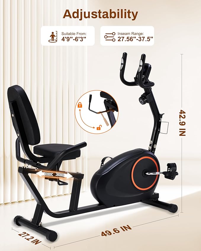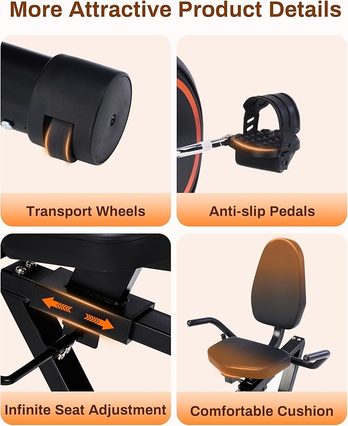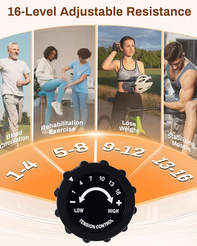 - Stepless Sliding for Quick Adjustment: Equipped with an adjustment handle, you can adjust the seat position and height effortlessly during your workout—no need to stop or get up. Additionally, this recumbent bike for adults features 16 levels of magnetic resistance, enabling you to tailor your workout to your individual needs and achieve your training goals.