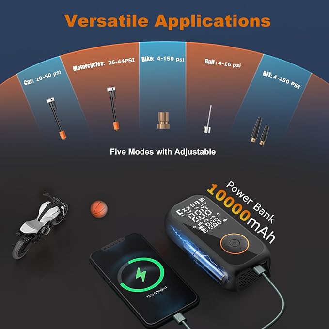 - 4+N Inflation Modes: Features 4 preset modes (bike, motorcycle, car, ball) and a customizable mode for pressures from 3-150 PSI. Switch between PSI, KPA, BAR, and KG/CM² units to suit diverse inflation needs