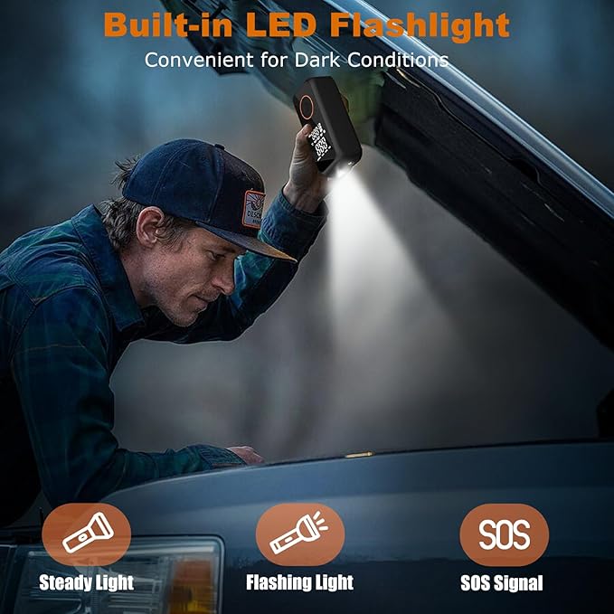 - Multifunctional Utility: Ideal for inflating vehicle and bike tires, balls, and more. Includes a 5V/2A USB port for charging devices and an LED emergency light, perfect for nighttime use or roadside assistance