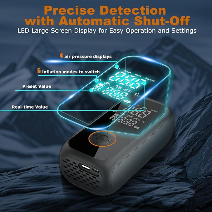 - Dual LCD Screen Display: Simultaneously view real-time pressure and preset values on a dual digital LCD display. With a maximum pressure of 150 PSI and 30 L/min airflow, it inflates small car tires in under a minute and auto-stops for safety