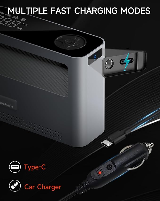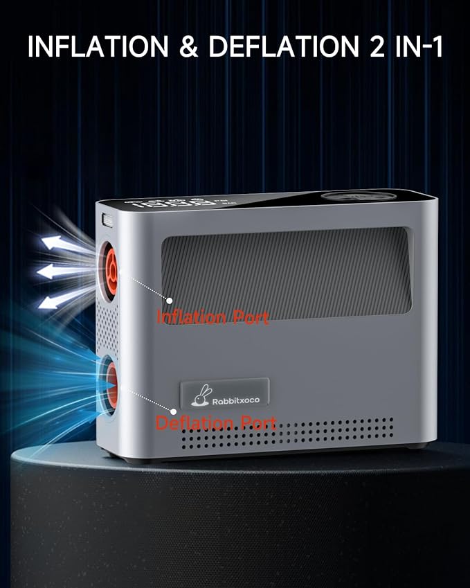 - [RABBITXOCO 2024 Electric Air Pump] Air pump built-in 120W high-power motor at the same time using dual pumps for inflating and deflating, 4X inflate speed air inflator 500L airflow per minute for 0~150PSI full range of air pressure, 30~50 seconds to fill a variety of balls, 1~2 minutes to fill a variety of models of tires, 2~3 minutes to fill the air beds, tents, 10-15 minutes to full paddle board, kayak. Note: First use requires a full charge