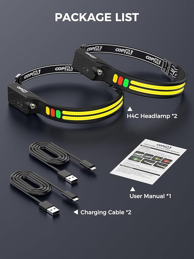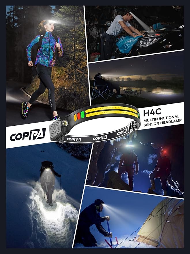 COPPA Headlamp, H4C Headlamp Rechargeable 2Pack with White & Yellow & Red & Green Floodlight & Spotlight Mini Portable with Motion Sensor Super for Camping Running Fishing Climbing Hiking Maintenance