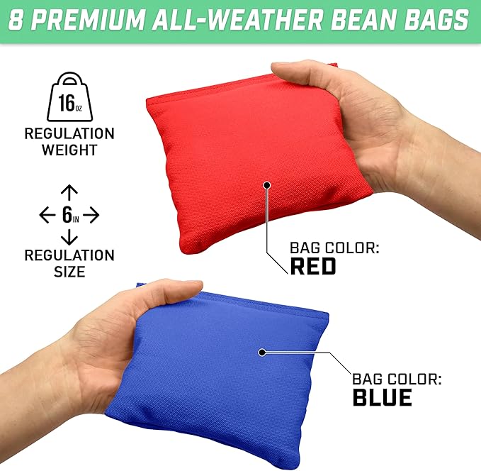 - FULL SIZE: Includes two 4 x 2 ft cornhole boards for authentic gameplay, 8 all-weather regulation bean bags, bean bag tote, and rules; Great for outdoor games in the backyard, at the park, or on the beach