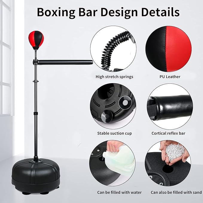 - Stable and durable base: The base of the boxing speed trainer comes with 6 strong suction cups to provide stability for the device. You can fill the base with sand and water mix, the base is more stable
