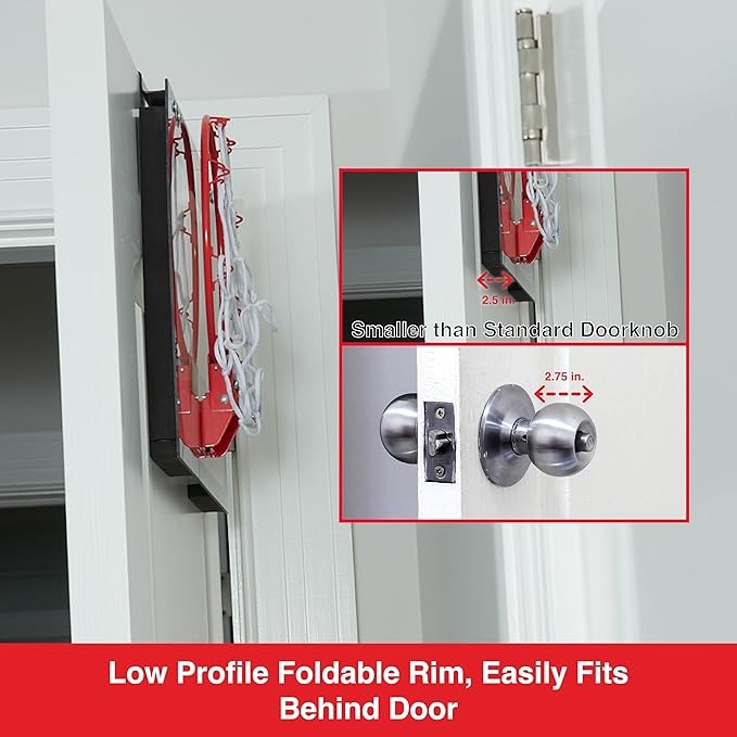 - Over The Door Design: Easy to set up and install on any door, this indoor basketball hoop is designed for durability. A foldable breakaway rim ensures the backboard stays put while the door is opened or closed.