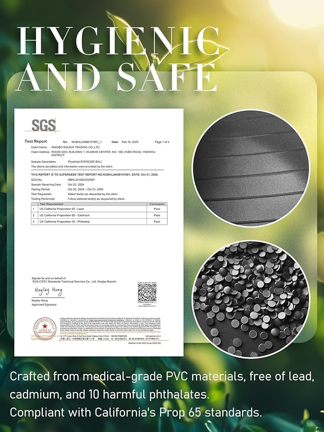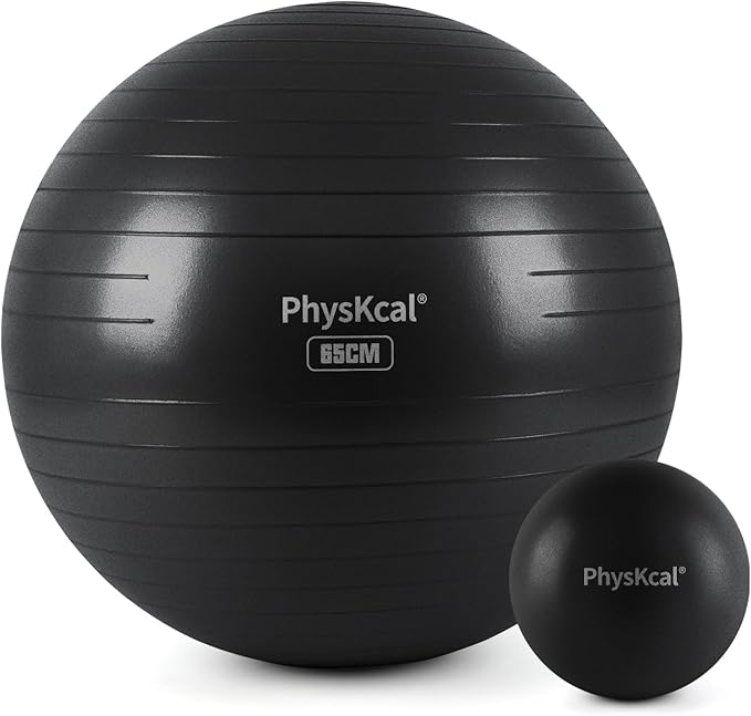 - The PhysKcal Gym Ball with Small Pilates Ball Set is a high-quality, anti-burst fitness accessory that supports up to 300kg/660lbs dynamic load and 2000lbs for static load due to its premium PVC material. Enhanced with an anti-slip frosted finish, this gym ball ensures a secure grip during exercises, promoting balance and stability. Crafted from upgraded 16p-free PVC, this gym ball is free from harmful chemicals like phthalates, latex, and BPA, making it a safe choice for various exercises, seating, and even during pregnancy. The gym ball's versatility is highlighted by its ability to strengthen core muscles, as evidenced by athletes like Lebron James incorporating it into their training routines. Additionally, the unstable nature of the gym ball activates spinal muscles, enhancing torso strength and stability. The product includes essential accessories such as a hand pump, plugs, plug remover, graphic instructions, and a measuring tape to ensure proper inflation and maintenance. Detailed guidance for selecting the appropriate gym ball size for different uses is provided in the package. For any inquiries or assistance, customers can contact the seller directly through Amazon or email support.