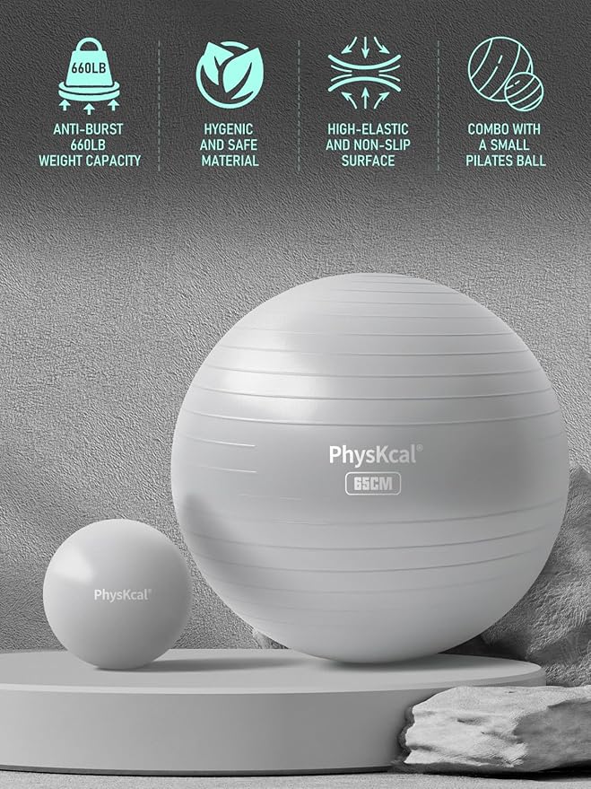 - The PhysKcal Gym Ball with Small Pilates Ball Set is a high-quality, anti-burst fitness accessory that supports up to 300kg/660lbs dynamic load and 2000lbs for static load due to its premium PVC material. Enhanced with an anti-slip frosted finish, this gym ball ensures a secure grip during exercises, promoting balance and stability. Crafted from upgraded 16p-free PVC, this gym ball is free from harmful chemicals like phthalates, latex, and BPA, making it a safe choice for various exercises, seating, and even during pregnancy. The gym ball's versatility is highlighted by its ability to strengthen core muscles, as evidenced by athletes like Lebron James incorporating it into their training routines. Additionally, the unstable nature of the gym ball activates spinal muscles, enhancing torso strength and stability. The product includes essential accessories such as a hand pump, plugs, plug remover, graphic instructions, and a measuring tape to ensure proper inflation and maintenance. Detailed guidance for selecting the appropriate gym ball size for different uses is provided in the package. For any inquiries or assistance, customers can contact the seller directly through Amazon or email support.