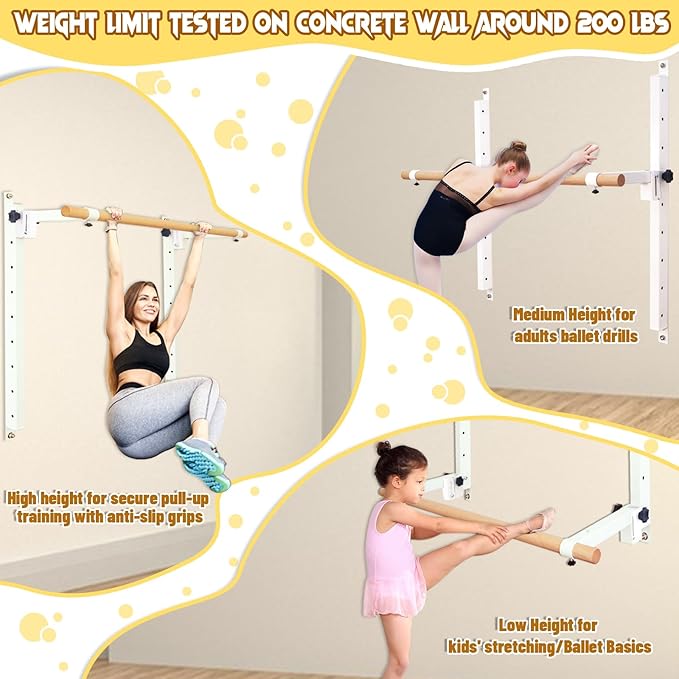 - Fully Height Adjustable :The dance barre can fully adjustable with a range of 36" ,9 heights, each height distance 4",Length 4FT and 5 FT,width from bracket to wall is 13.4",easy adjust height by long hand knobs, you can customize the dance barre length to request position ,All home members can get its useful function by easily adjust height,It is perfect for kids adults to practice basic ballet or dance skills,fitness movements like pull ups,balance and other movement by additional stretching straps,one ballet equipment can achive more sports experious