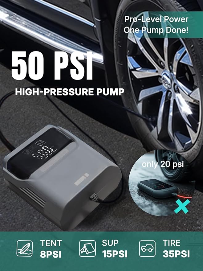- 【One Pump, All Solutions】: Niphean portable air pump (9.65*7.01*6.5 in, 3.22 lbs) has no built-in battery and can be powered through your car's cigarette lighter, eliminating battery life limitations. With a 50 PSI high-pressure capacity, it’s perfect for low-pressure items like basketballs, yoga balls, and tents, as well as high-pressure tasks like tires, paddle boards and kayaks. One pump, endless possibilities—making it your go-to solution for all inflating and deflating needs.
