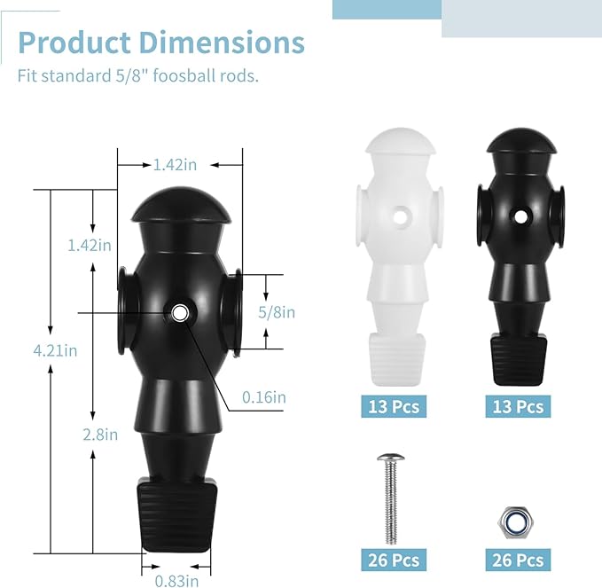 - Complete Set: Includes 26 foosball players,13 black and 13 white; each player stands 4.21" tall with a 0.16" back round hole diameter and 5/8" hole diameter, fitting standard 5/8" foosball rods; please check the sizes before purchasing