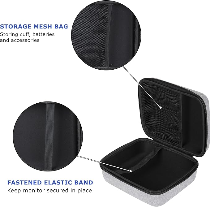 - WELL ORGANIZED – The blood pressure monitor organizer has a big compartment with fastened elastic band, which can hold your monitor secured stay in place without any movement. The internal mesh bag of the hard shell case is designed for storing cuff, batteries and other accessories. Blood pressure travel case keeps the monitor set in one place, preventing loss.