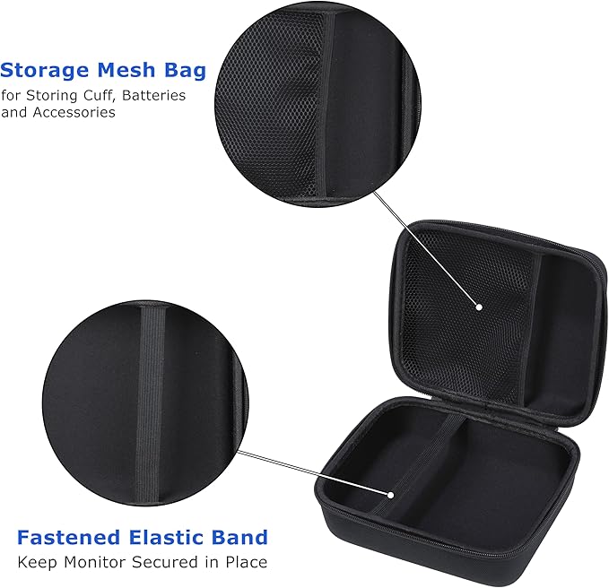 - WELL ORGANIZED – The blood pressure monitor organizer has a big compartment with fastened elastic band, which can hold your monitor secured stay in place without any movement. The internal mesh bag of the hard shell case is designed for storing cuff, batteries and other accessories. Blood pressure travel case keeps the monitor set in one place, preventing loss.