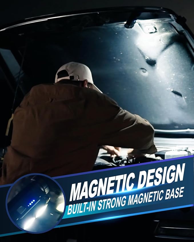 - Magnetic Detachable Design & Multi-Scenario Versatility The detachable lamp body transforms into a handheld flashlight, while its magnetic base securely attaches to metal surfaces like car roofs or pipes, enabling hands-free tasks such as tent ceiling lighting or undercarriage repairs.