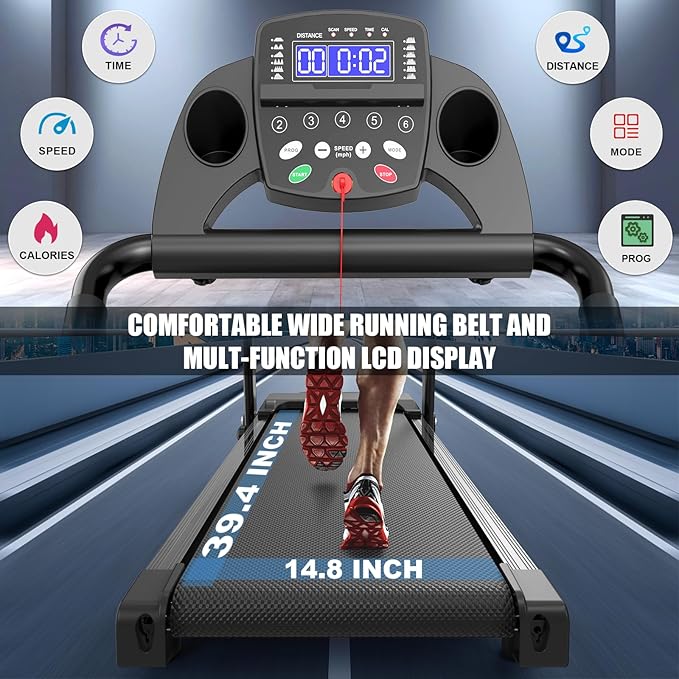 - 【Easy Operation】This treadmills for home offers two controls for ease of use: display buttons and a mobile app. Easily power on/off, adjust the speed, or pause the treadmill with handles to ensure a seamless and enhanced user experience every time. The foldable treadmill's clear and easy-to-read display shows basic metrics such as time, distance, speed, and calories burned, keeping you informed and motivated throughout your workout.