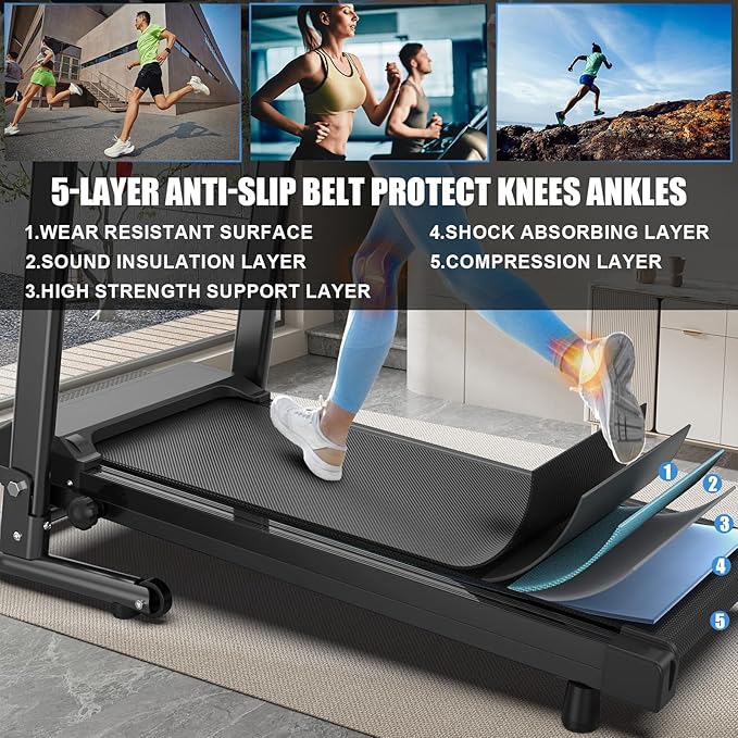 - 【Air cushion damping】Wide 8-layer non-slip textured running belt made of PVC + polyester fibers + cotton yarn is extremely resilient and comfortable for the treadmill with handles. Shock-absorbing running belts provide effective and safe cushioning for knees and muscles while running. Treadmill 40” long running belt size foldable treadmill provides plenty of space for a workout.