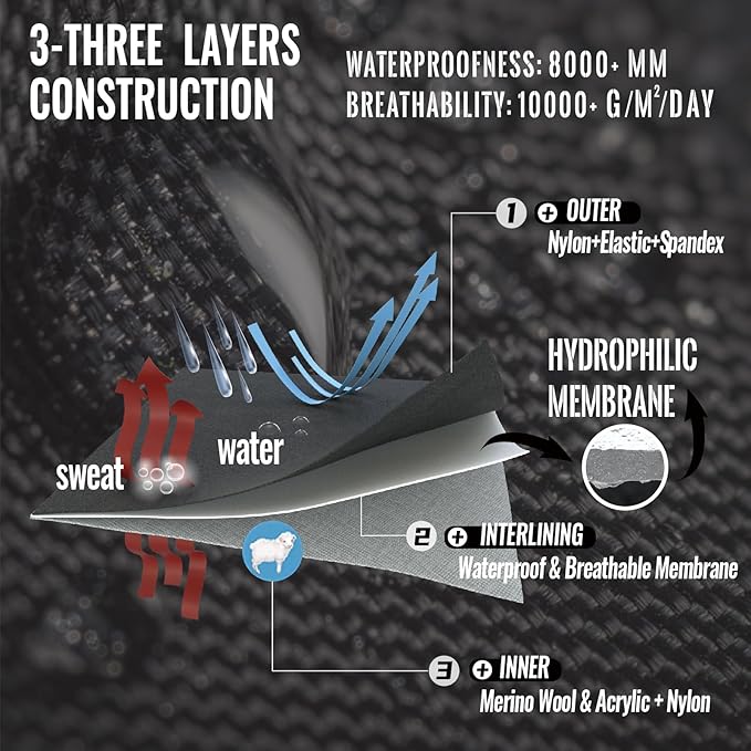 - Material : Inner Layer: 40% Merino Wool, 40% Acrylic, 18% Nylon, 2% Elastane, Middle Layer: Waterproof Breathable Membrane, Outer layer: 70% Polyester, 20% Nylon, 6% Elastic, 4% Elastane Inner Layer: 40% Merino Wool, 40% Acrylic, 18% Nylon, 2% Elastane, Middle Layer: Waterproof Breathable Membrane, Outer layer: 70% Polyester, 20% Nylon, 6% Elastic, 4% Ela… See more