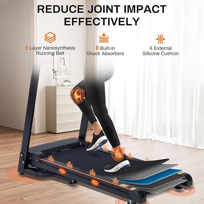 - 【8+4 Cushion System】18"x 42.5" Wider Belt-Spacious running area unleash your potential. Double high-strength running platform combines a 5-layer Nanosynthesis belt and new shock absorption system (8+4 cushioning), ensuring each step is gentle.