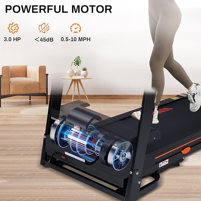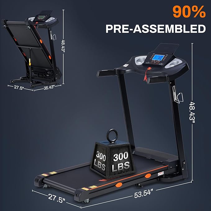 - 【300 LBS Capacity】Stable structural and premium heavy-gauge steel frame, equipped with a whisper-quiet 3.0 HP cooling motor delivering treadmills for home long-lasting performance. Weight capacity is to 300 lbs.