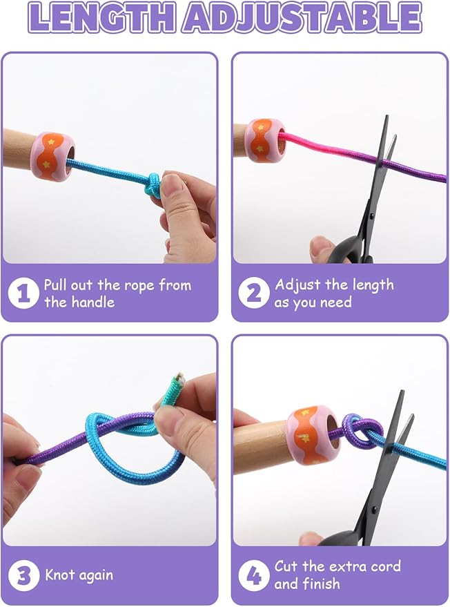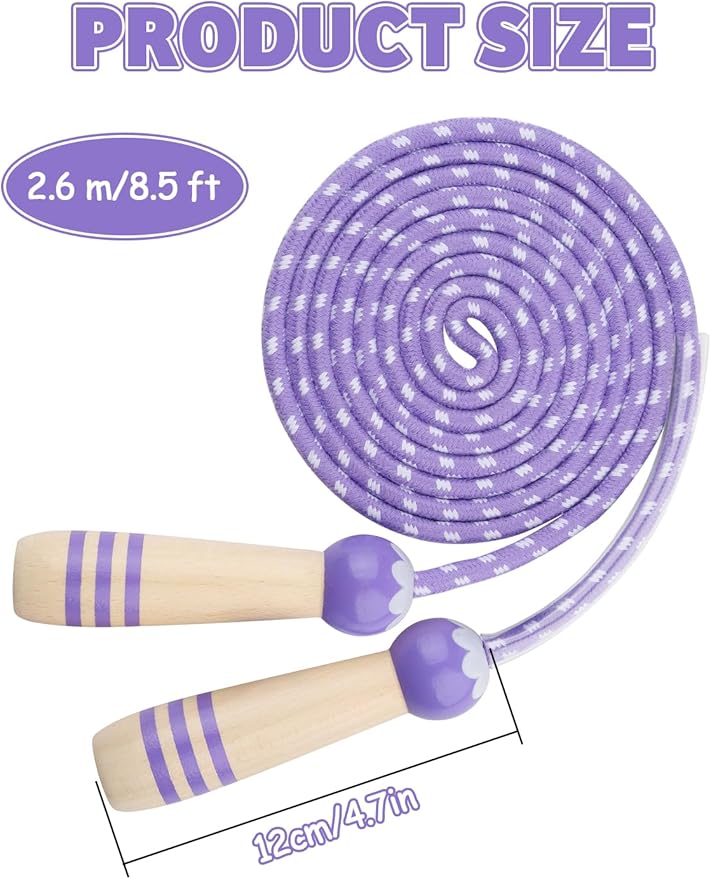 - KIDS JUMP ROPE--You will get 1 pcs 8.5ft/2.6m length children's skipping ropes with wooden handle(Purple Rope), which boys and girls like. Fun activity games can play with friends or family.