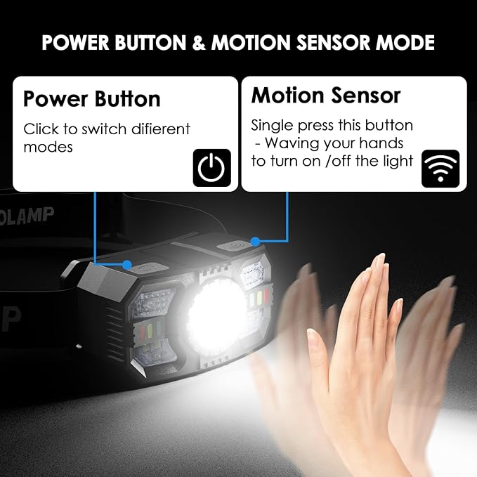 - 10 Modes & Motion Sensor: The headlamp flashlight has 10 modes to meet all your needs. ①Power Button-5 key modes, you can switch Main Light High, Main Light Medium, Side Light High, Red Light, White & Red Light Strobe. ②Motion Sensor Button-5 motion sensor modes, you can easily turn the lights ON/OFF by waving your hand.Long press power button for 3 seconds to turn off.