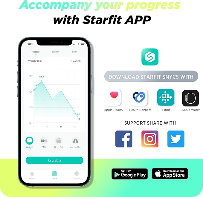 - SMART APP FITNESS TRACKING: Using the Starfit app allows you to set goals, analyze trends and track your health progress by week, month, and year. Can also generate and print detailed health analysis reports in the APP, and easily sync data with Apple Health, Health Connect, and F1tbit, or share with friends on social media
