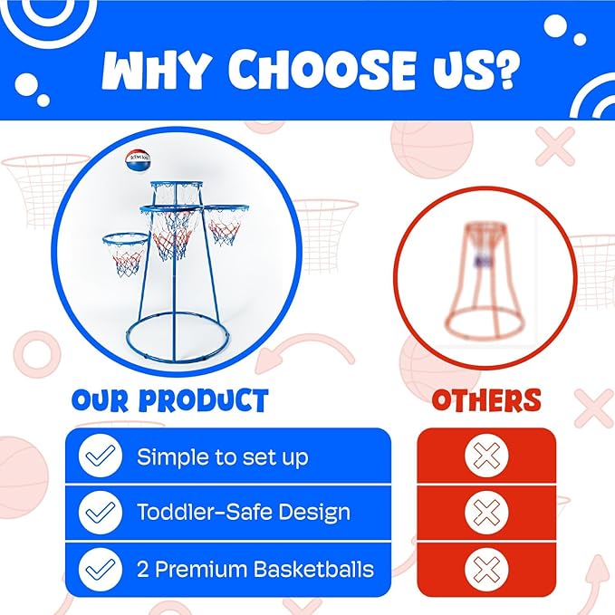 - WHAT'S IN THE BOX – Comes with 2 quality basketballs for kids, an air pump, and a sturdy 4-hoop basketball system for endless fun.