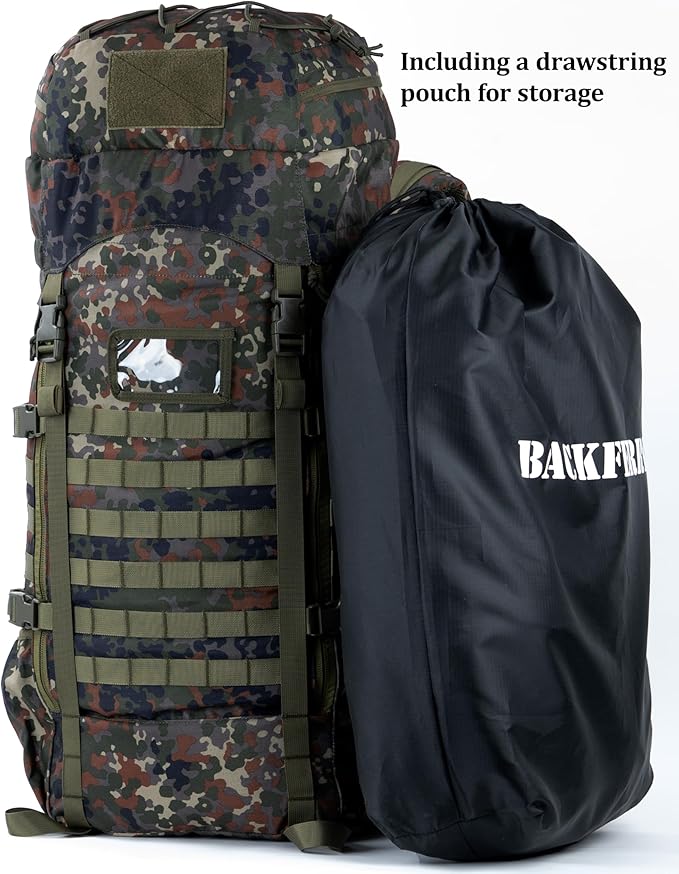 - Built with heavy-duty, abrasion-resistant, and water-resistant polyester fabric, this large tactical backpack features high-quality zippers and buckles throughout for exceptional durability. The internal frame is engineered to withstand harsh conditions, making it ideal for backpacking, camping, hunting, and other outdoor adventures.