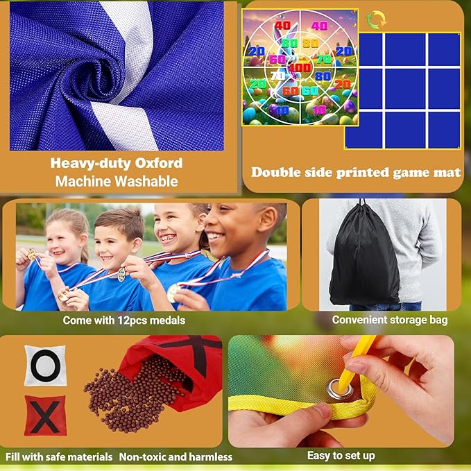- 2 in 1 Outdoor Tic Tac Toe Games: This outdoor game combines two games into one game mat. One side is printed with bunny and egg patterns for the outdoor party bean bags toss, and the other side is the Giant Tic Tac Toe game. The double-sides can be switched back and forth to explore a variety of gaming experiences