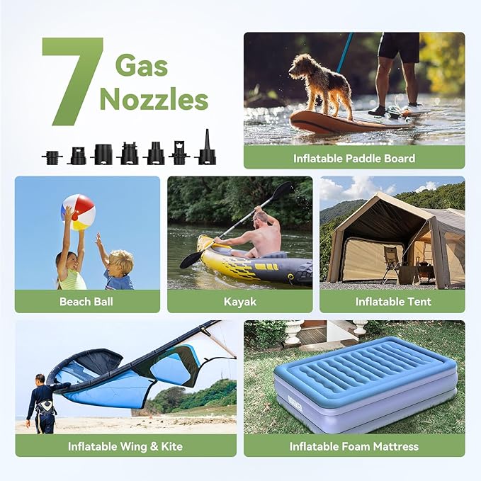 - 【VERSATILE & ALL-INCLUSIVE】 Comes with multiple nozzles to fit most high-pressure inflatables, including paddleboards, air beds, kayaks, boats, tents, and more. One pump to handle all your inflatable gear!