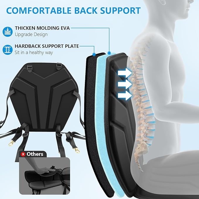 - Reinforced Back Support - Say goodbye to lower back strain! Our reinforced backrest with a sturdy PE plate provides extra rigidity and lumbar support, helping to maintain proper posture throughout your paddling journey. This ergonomic design minimizes discomfort, so you can paddle for hours without soreness or fatigue.