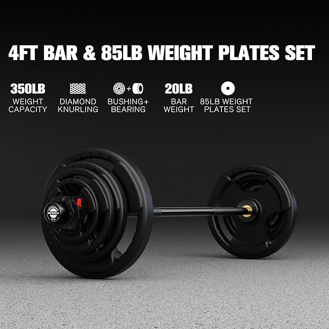 - 【85LB Barbell Set】The set includes a 4-foot barbell with a pair of collars and a set of 85lb weight plates: 2x2.5lb, 2x5lb, 2x10lb, 2x25lb. With the barbell included, the total weight adds up to 105lb. These cost-effective equipment are perfect for long-term training use.