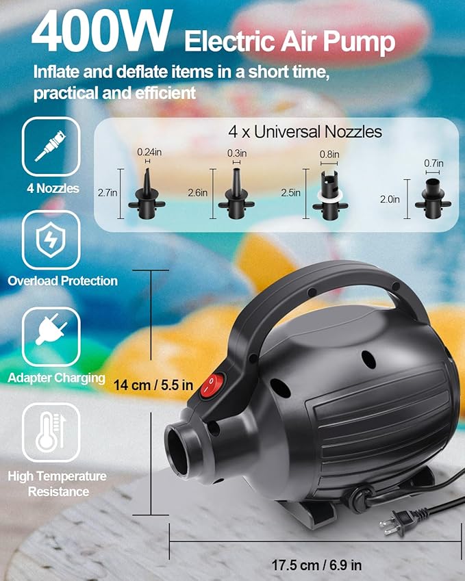 - Dual-Function Inflation and Deflation: The air pump for inflatables supports both inflation and deflation, suitable for inflatable mattresses, inflatable floating docks, gymnastics mats, vacuum compression bags, pool floats and other items. It comes with 4 detachable nozzles and retractable hose, offering flexibility for different inflation needs and easy operation.