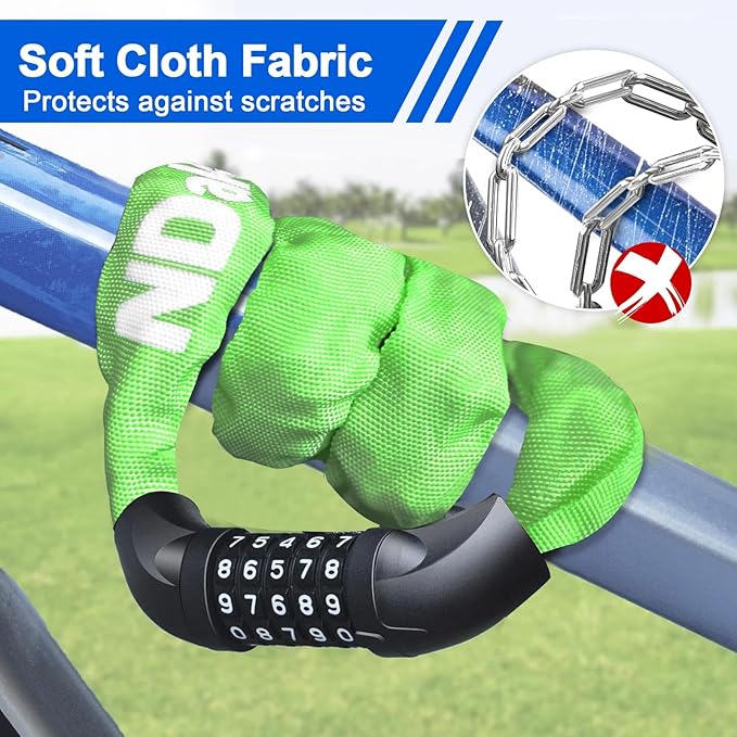 - SCRATCH-PROOF FABRIC PROTECTION: The bicycle chain lock is wrapped by a high quality polypropylene fabric, which is scratch-proof and wear-resistant, anti-hot and anti-icing hands; it protects the chain and prevents it scratching your bicycle frame, long lifespan.