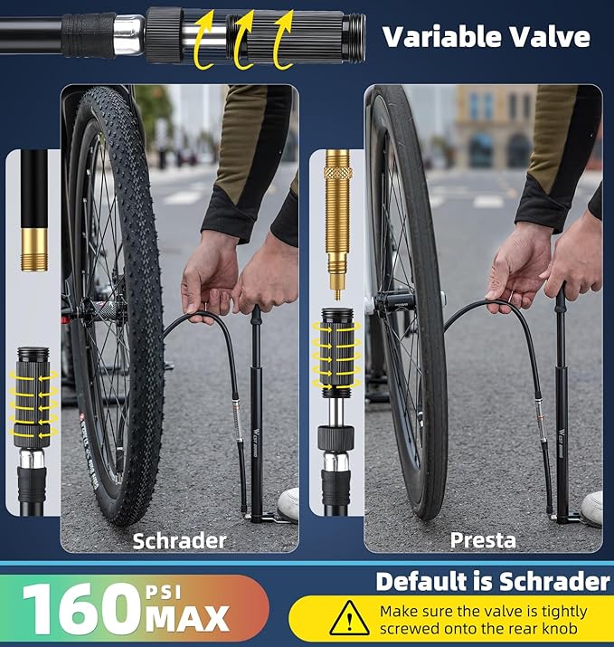 - 【Presta/Schrader Valve Bicycle Pump】 No adapters needed, as it is universally compatible with both Presta and Schrader valves. By unscrewing and extending the top thread, it becomes a Presta valve. By screwing down and shortening the top thread, it becomes a Schrader valve. It can be used to inflate road bike, mountain bike, BMX, children's bike, and more.(Note: When using a Schrader valve, the upper threaded knob needs to be tightened and closed, otherwise there will be resistance and more effort when pumping.)