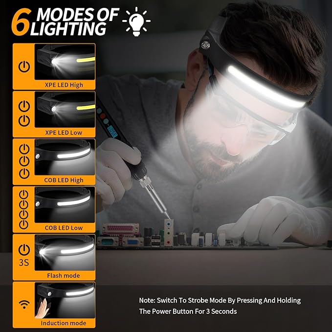 - 【Motion Sensing & 5 Light Modes】Head lamps have 6 working modes, including COB high mode, COB low mode, LED high mode, LED low mode, and strobe mode to meet all scenarios. The head lamp has sensitive intelligent sensor, so that you can press the sensor mode button and turn the head flashlight on or off with a wave of your hand.