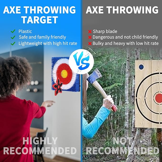 - EASY TO CARRY AND LIGHTWEIGHT DESIGN: The throwing axe is compact and lightweight, easy to maneuver and control, the long plastic handle is burr-free and non-cracking to protect your hands, durable and impact-resistant, this axe throwing game set is more suitable for beginners than the traditional sharp and dangerous axe throwing and ensures safe and convenient carrying and storage.