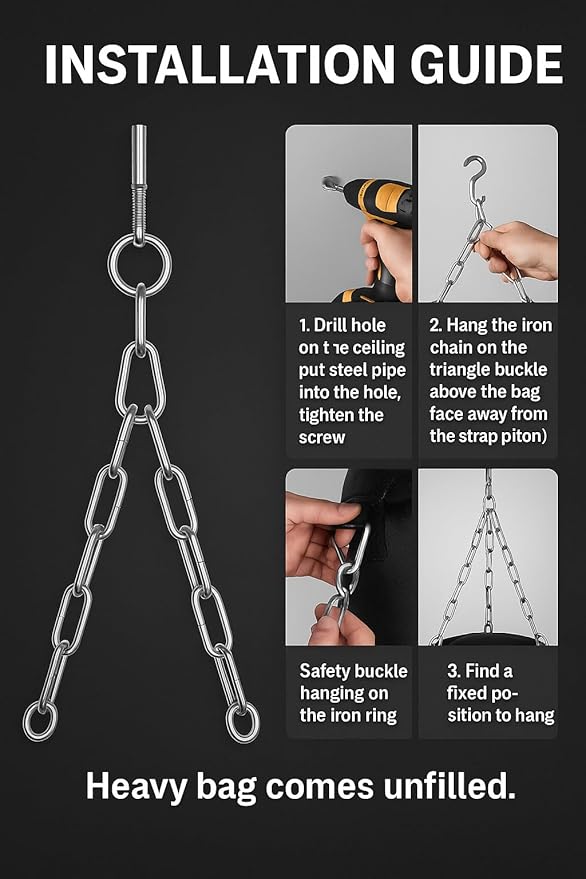 - Stainless Steel 360° Swivel -The heavy boxing bag for adults comes with a 360° rotating hanger, allowing smooth and flexible movement. The robust design ensures strong load-bearing capacity, providing enhanced safety and stability during use.
