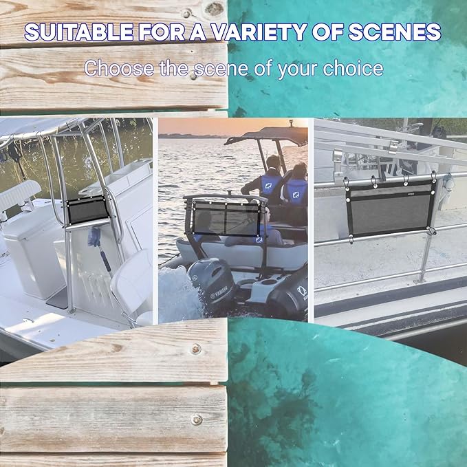 - [Easy Installation]: Each set of boat storage organizer bag has 6 positioning elastic loops with ball Latching system.You can insert the elastic cord into the different holes on the storage nets for boats to fit different scenarios of fixing needs, And adjust the elasticity as needed.