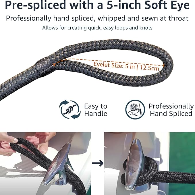 - The fender lines for boats are professionally hand spliced and whipped at the eye-splice joint and bitter end to ensure maximum strength and durability. Heat sealed & glue wrapping help deter cut ends of the boat rope from unraveling
