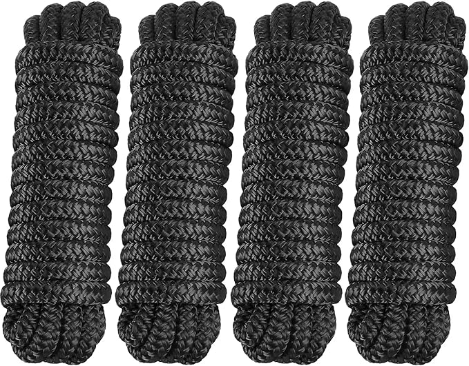 4 Pack 3/8" x 20' Dock Lines - Marine Grade Nylon Boat Rope with 12" Loop for Docking and Mooring - Double Braided Boat Lines, High Strength, Easy Handling, Fray Resistant - Black