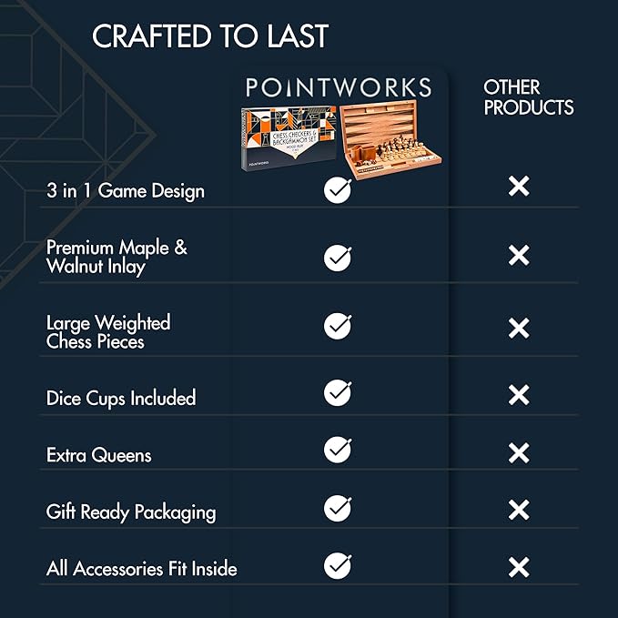 - Crafted to Impress: The Walnut and Maple inlay and solid Acacia Wood frame complete with large weighted chess pieces and premium acrylic checkers and dice. This luxury chess set makes this set an heirloom to last generations