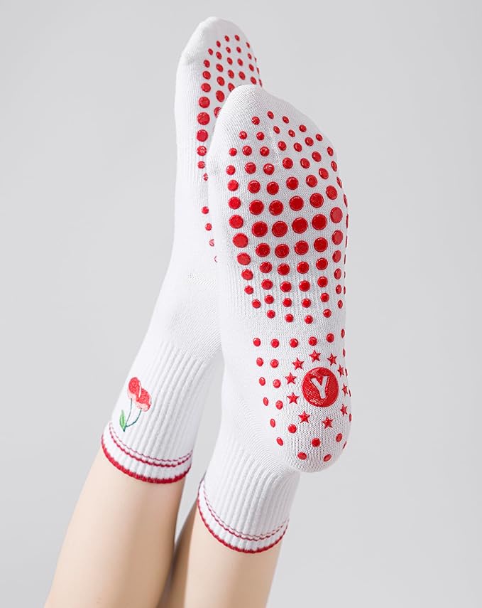 - 【Fashionable Cherry and Stripe Design】 This Pilates sock is adorned with a unique cherry element, featuring lifelike red cherry patterns that add a pop of color and symbolize sweetness and vitality. The red stripes, on the other hand, create a visual effect that elongates the leg line, making your legs appear more slender. The overall design ensures you feel fashionable even while exercising.