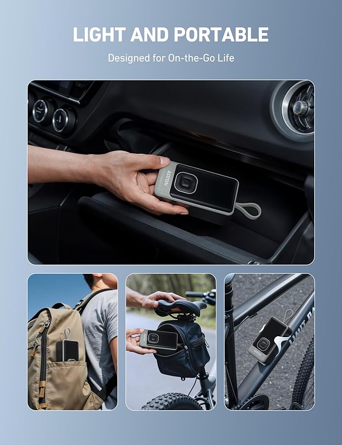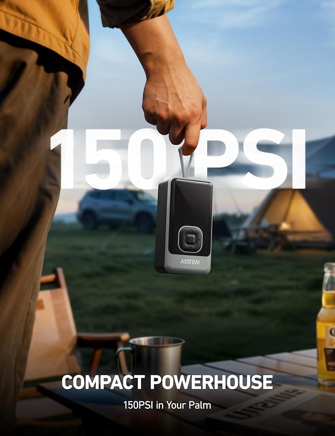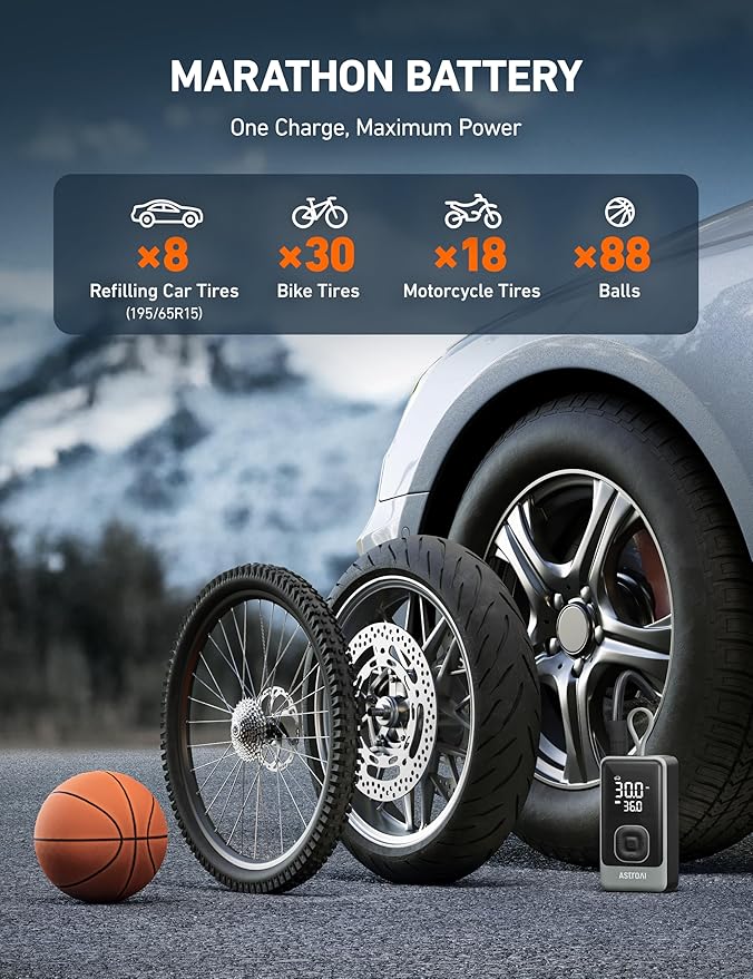 - LONG ENDURANCE, MORE INFLATION: Once fully charged, it can refill 8 car tires, or inflate 30 bike tires, 88 balls, or 18 motorcycle tires. Its intelligent battery management system monitors the power in real-time, making it perfect for long trips, outdoor activities, and daily commuting
