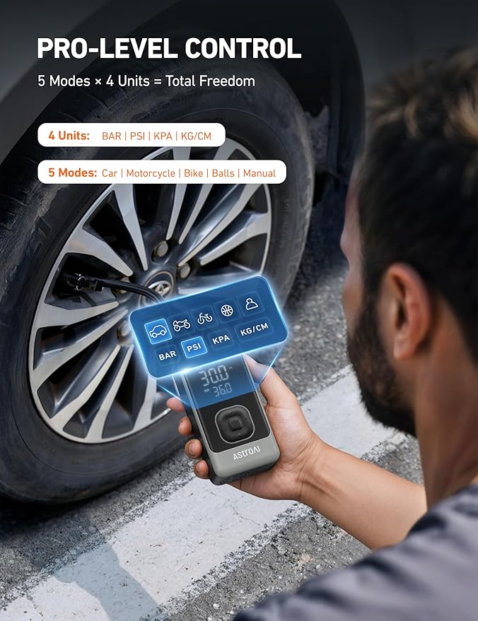 - EASY TO USE & AUTOMATIC SHUTOFF: Features 5 preset modes (Car/Motorcycle/Bicycle/Ball/Manual) with one-touch activation. Supports switching between PSI/kPa/BAR/kg/cm² units. The large display shows presets and data in real time, while the auto-stop function prevents overinflation for precision and safety