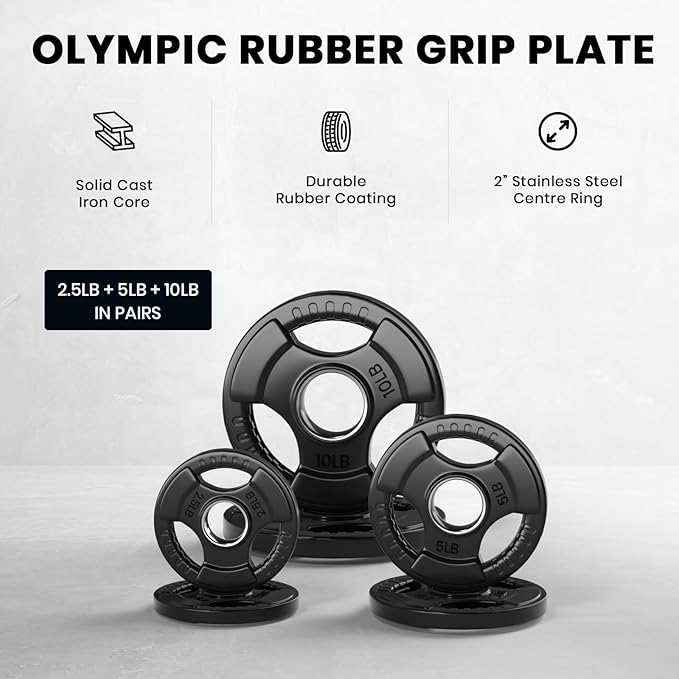 - Solid and Ultra Durable Weight Plates: Made of heavy-duty cast iron with a machined stainless-steel hub to ensure a reliable weight that will last through grueling workouts. Each plate has 3 openings with strips on them for easy and secure grip when loading and unloading the weights. Coated with dense rubber to alleviate damage to floor and labeled in LB for easy recognition, the plate set forms a great complement to the EZ curl bar.