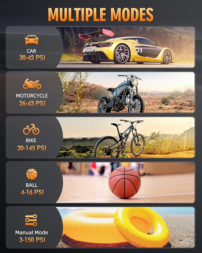 - 【4+N Smart Modes】The air compressor offers four types of pressure measurement units: PSI, KPA, BAR, and kg/cm². It also provides four preset inflation modes: bicycle, motorcycle, car, and ball. The fifth manual mode allows you to customize the pressure value according to the specific inflation target. It is extremely convenient for both daily life and travel needs