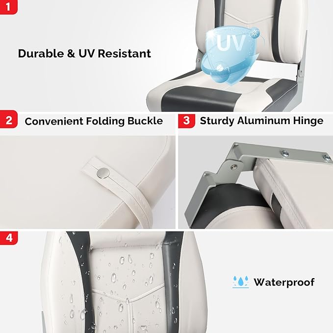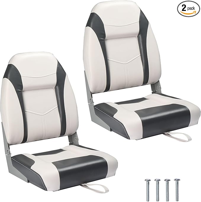 PEXMOR Boat Seats Low/High Back, Folding Boat Seat Included, Fold-Down Fishing Boat Seats Waterproof Captain Boat Seat w/Aluminum Hinges & Thick Soft Cushion, 2 Packs (High Back-Grey & White)