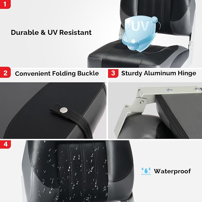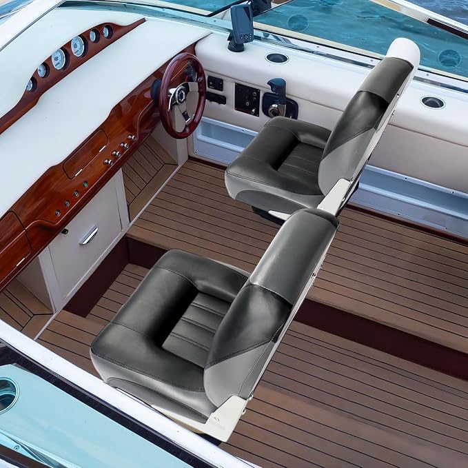 PEXMOR Boat Seats Low/High Back, Folding Boat Seat Included, Fold-Down Fishing Boat Seats Waterproof Captain Boat Seat w/Aluminum Hinges & Thick Soft Cushion, 2 Packs (Low Back-Grey & Black)