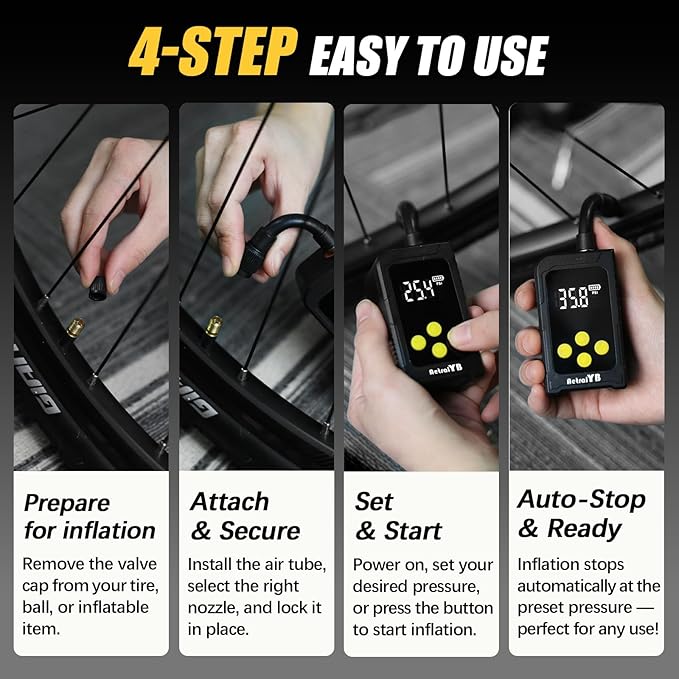 - 【HIGH ACCURACY & AUTO SHUTOFF】 – The bicycle pump with 0.5% Accurate,Easy, Safe, and Accurate Inflation: Set your desired pressure using the "+" and "-" buttons, with short presses adjusting by 0.5 increments and long presses by 5.0 increments. This electric bike pump automatically stops when the set pressure is reached, preventing overinflation and ensuring worry-free operation, far more efficient than normal floor pump.